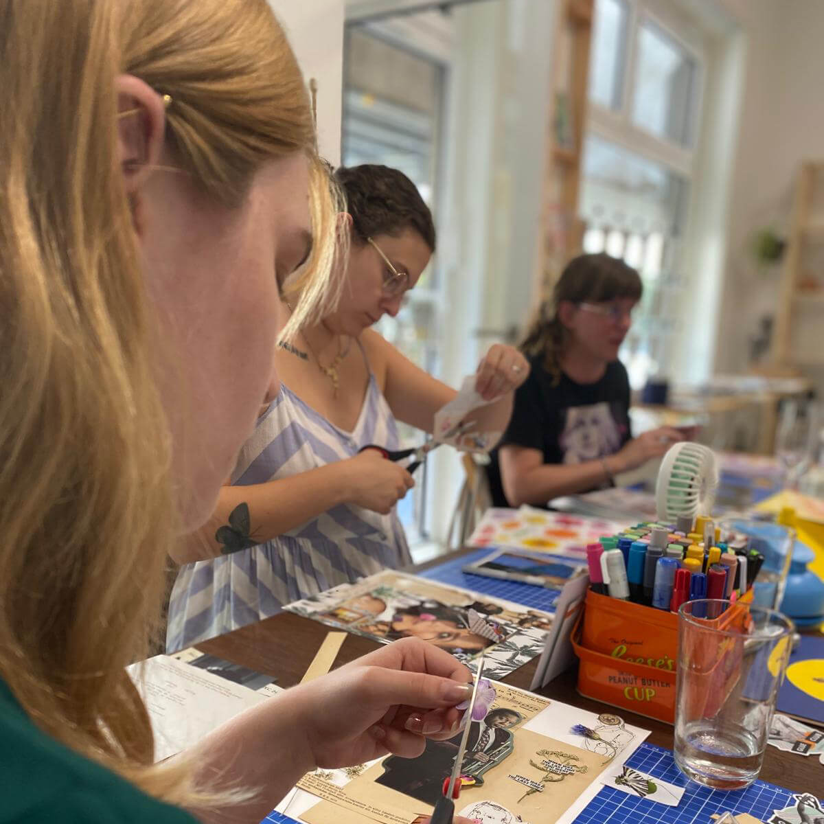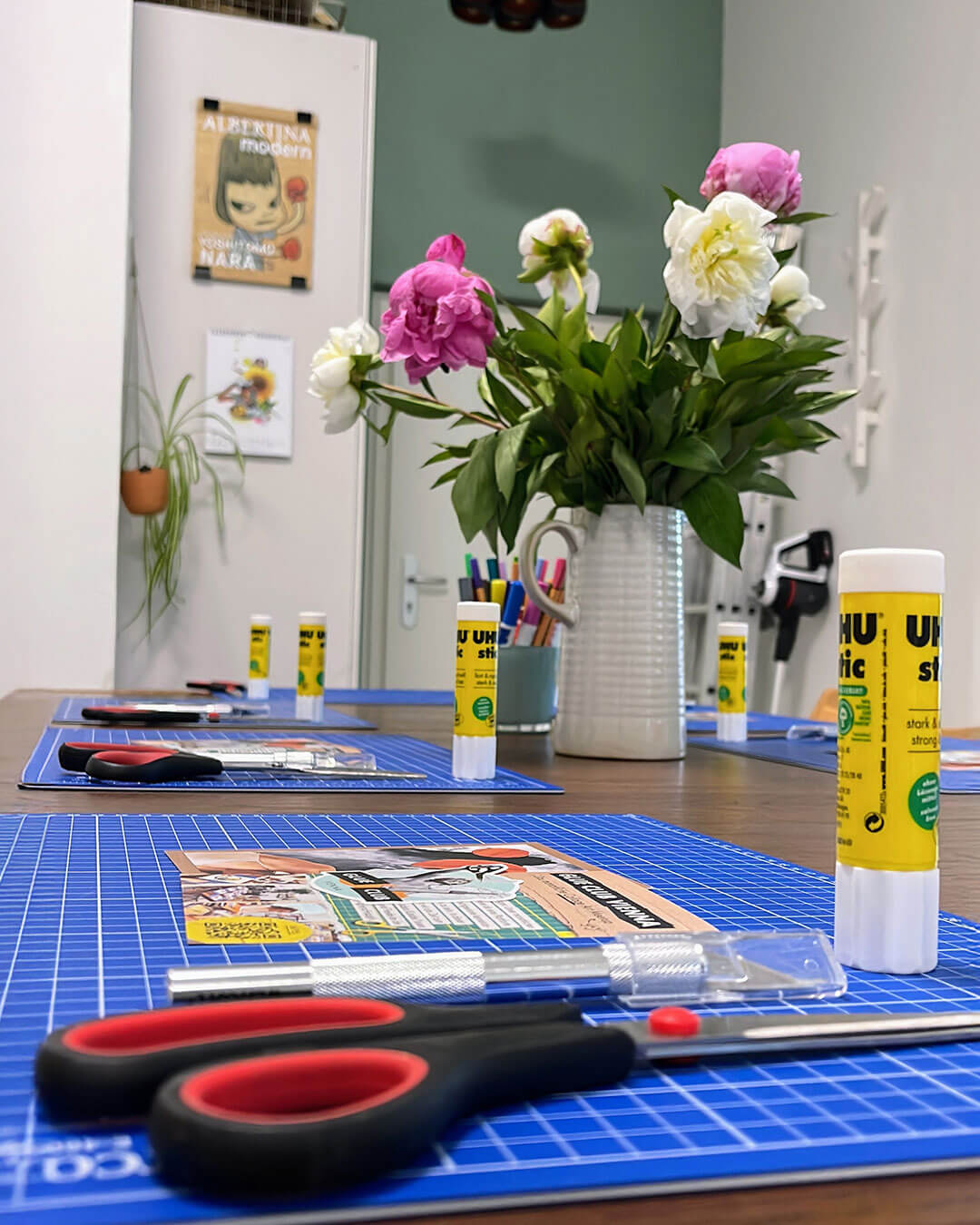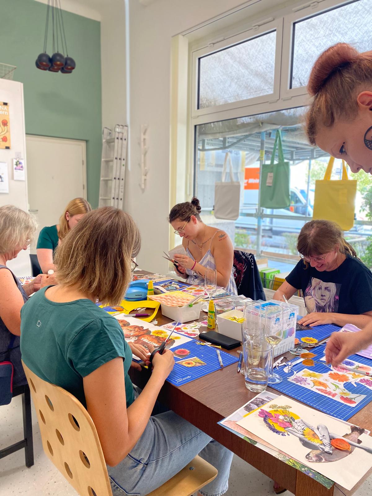 Im Studio wartet eine große, liebevoll kuratierte Magazine-Sammlung, dazu Motivstanzen, Washi Tape, Papier in allen Varianten. Der Tisch darf dabei ruhig messy werden (ist sogar ein bisschen erwünscht), der Vibe bleibt angenehm entspannt.
